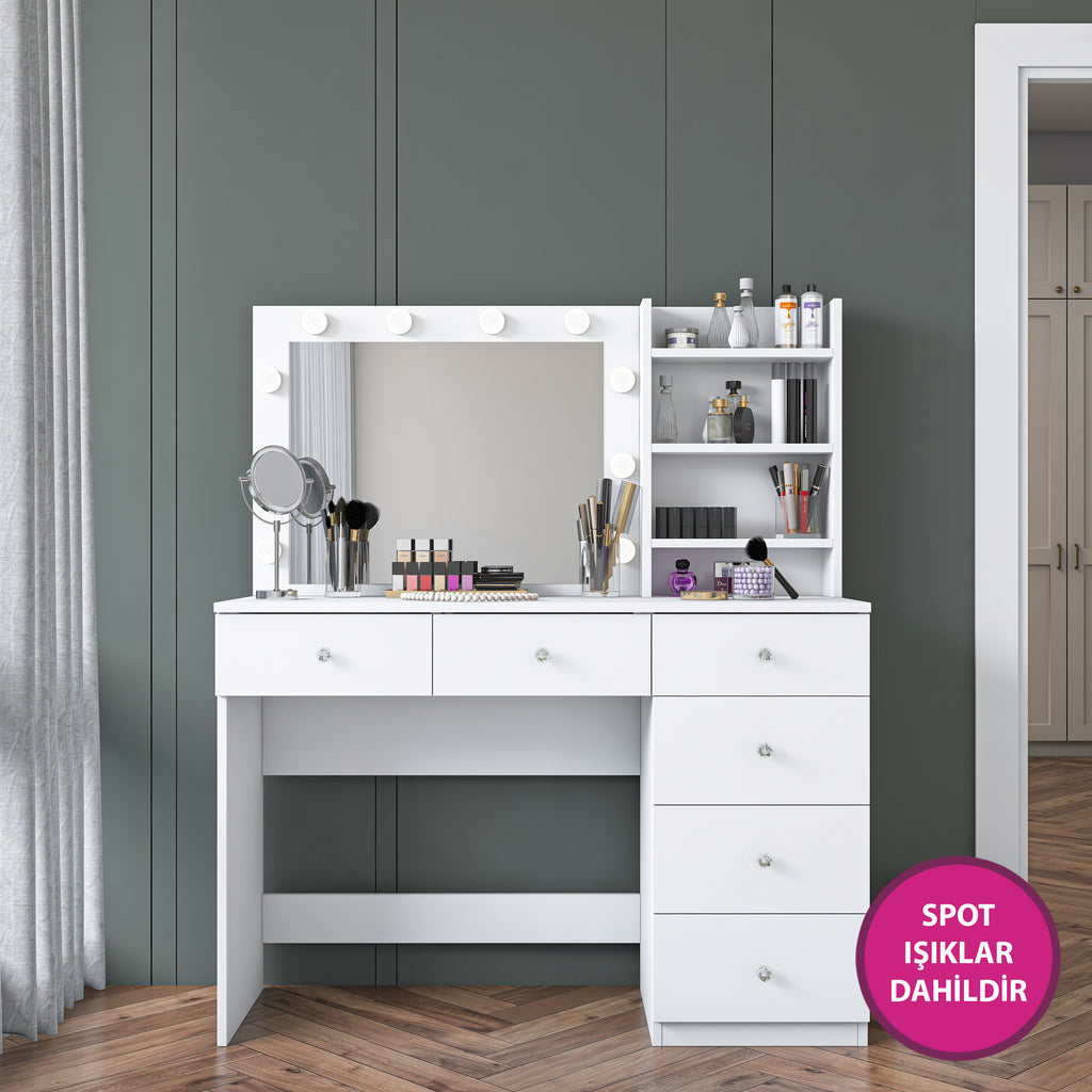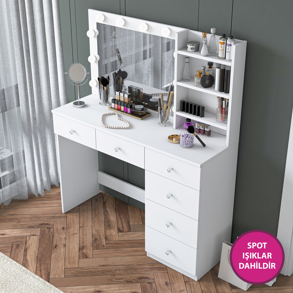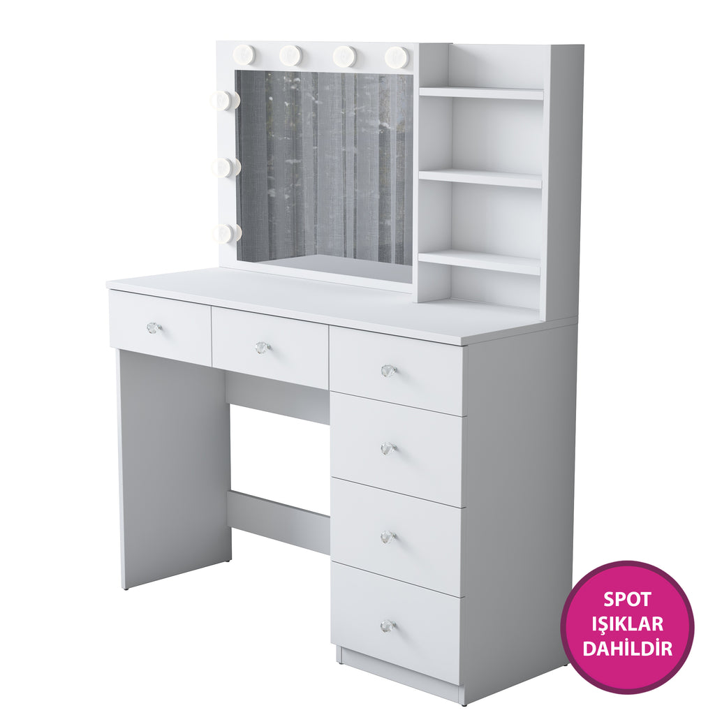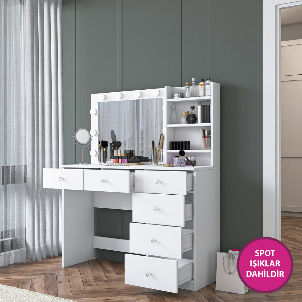 Rani BJ127 Hollywood Işıklı Aynalı Kulis Makyaj Masası 6 Çekmeceli Takı Düzenleyici Beyaz