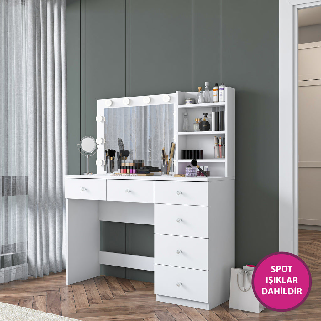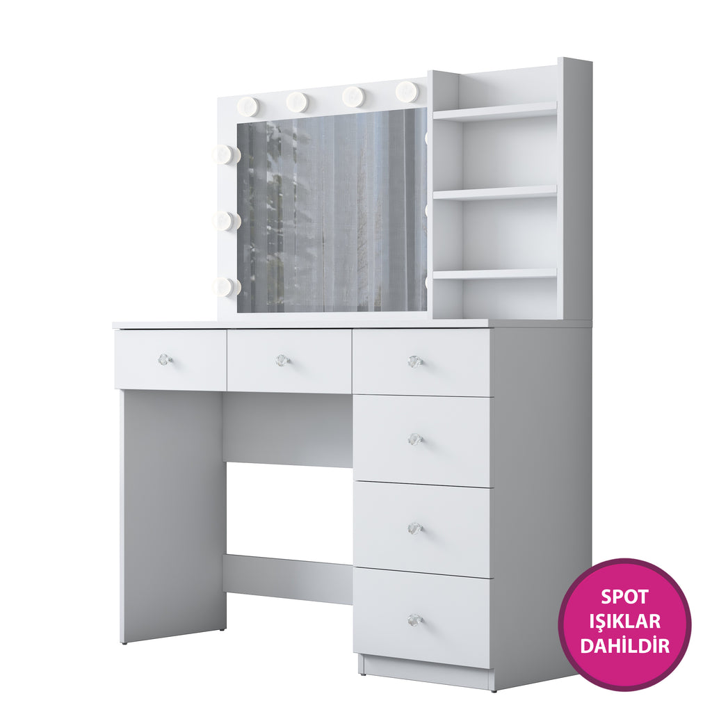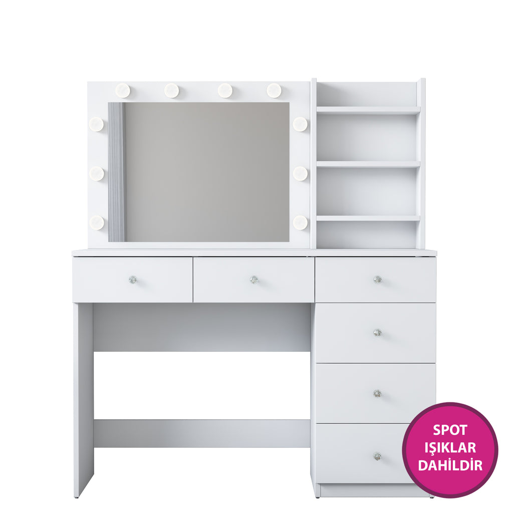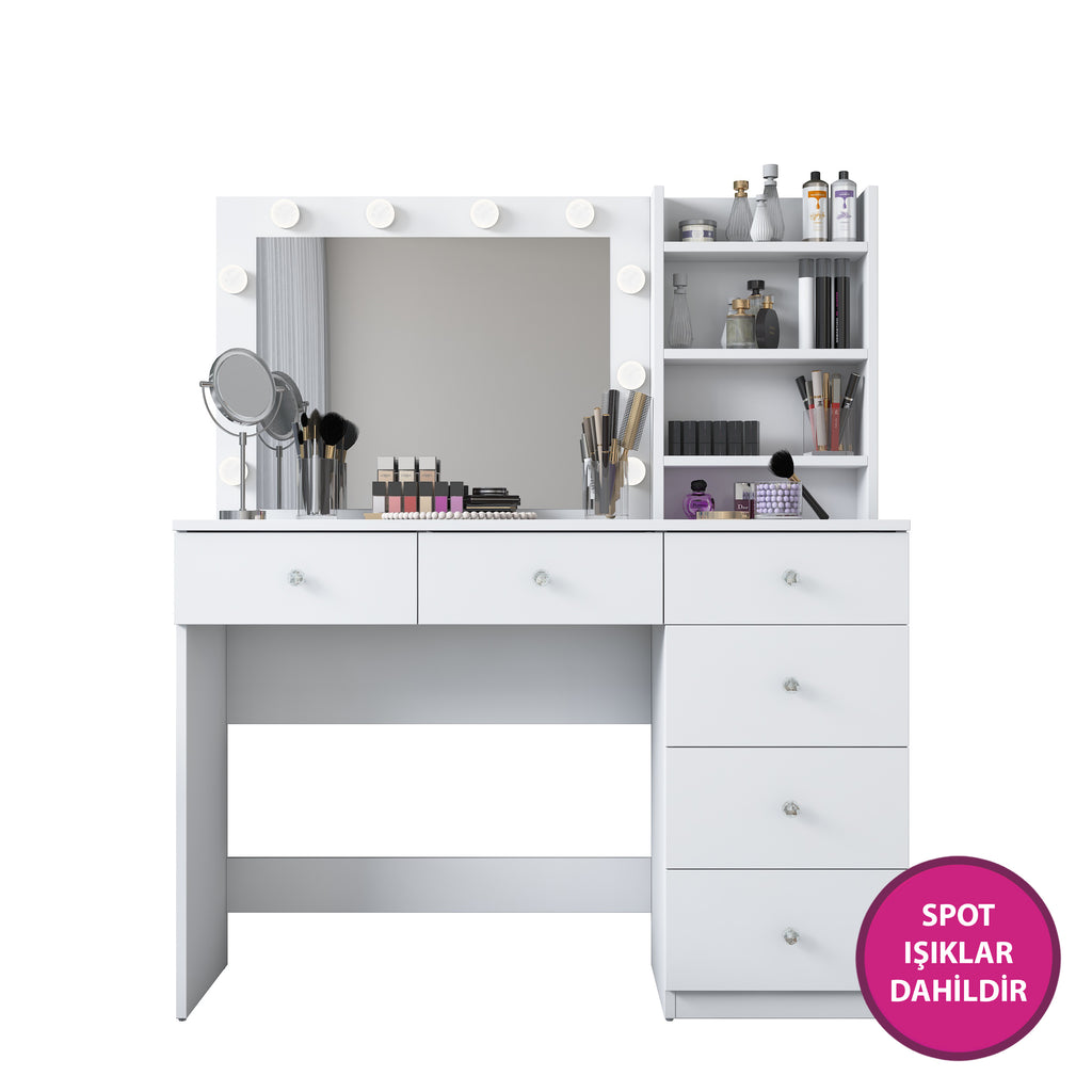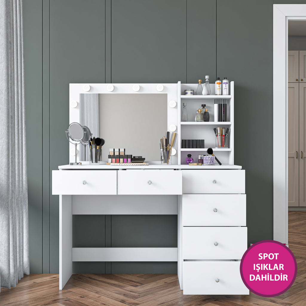 Rani BJ127 Hollywood Işıklı Aynalı Kulis Makyaj Masası 6 Çekmeceli Takı Düzenleyici Beyaz