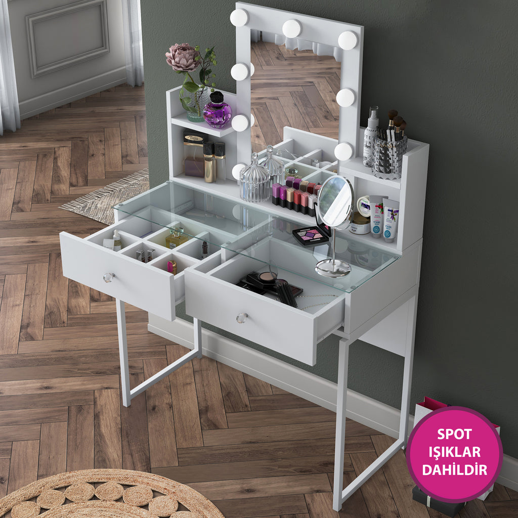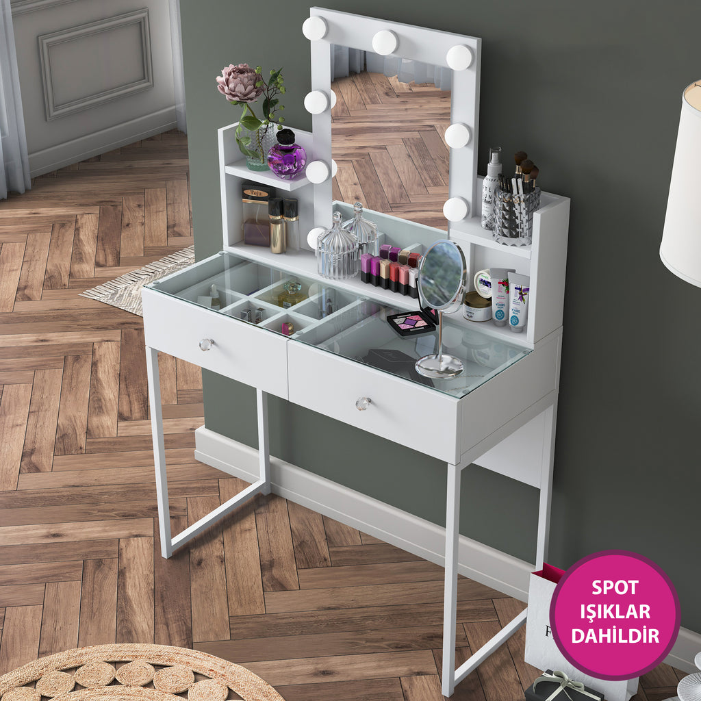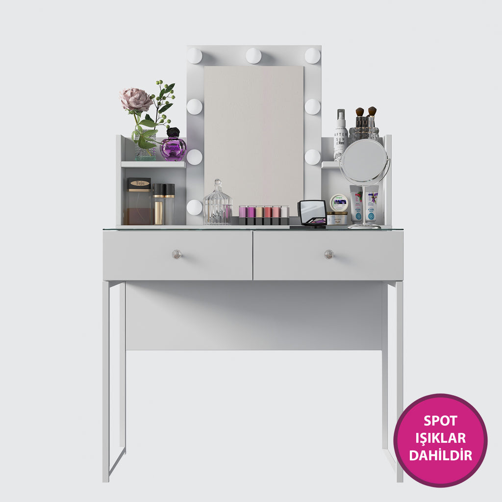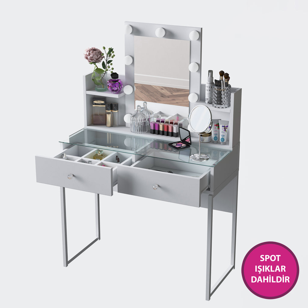 Rani BJ145 Hollywood Işıklı Aynalı Kulis Makyaj Masası Cam Tablalı 2 Çekmeceli Takı Düzenleyici Beyaz