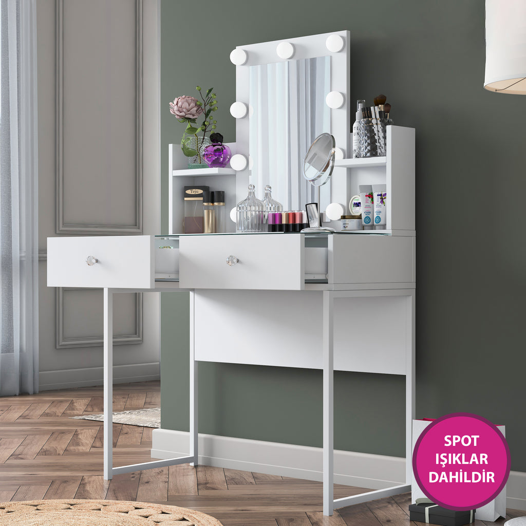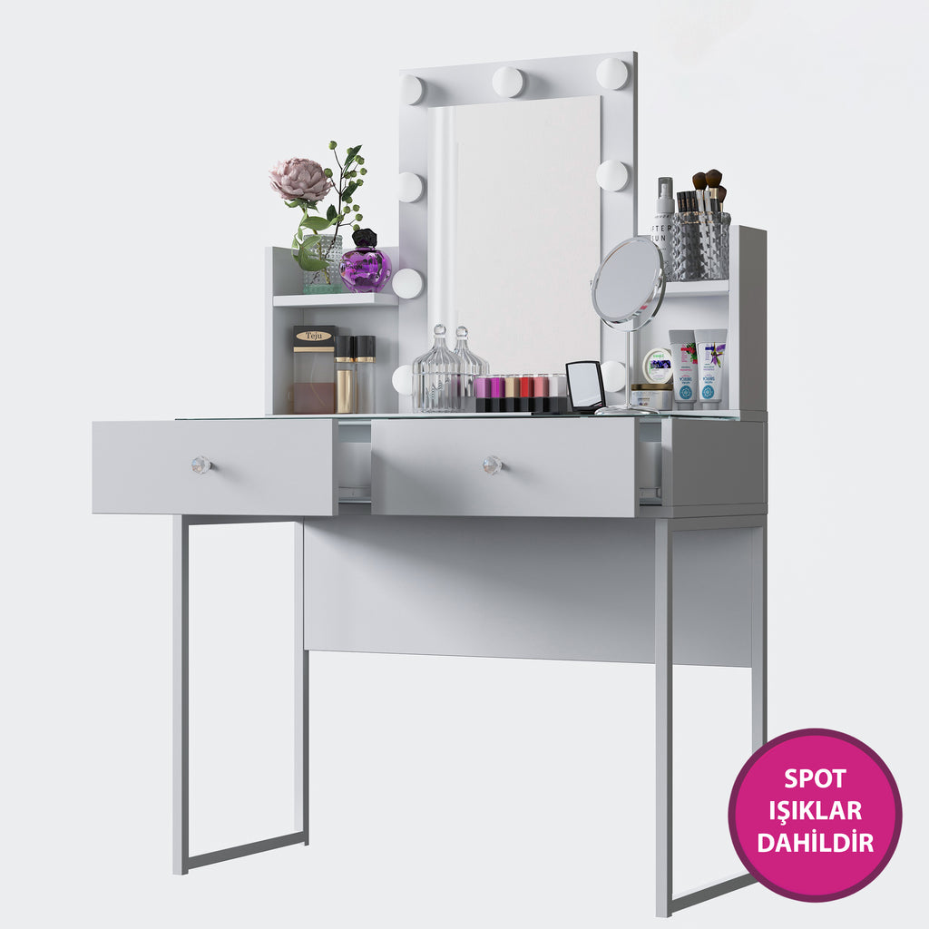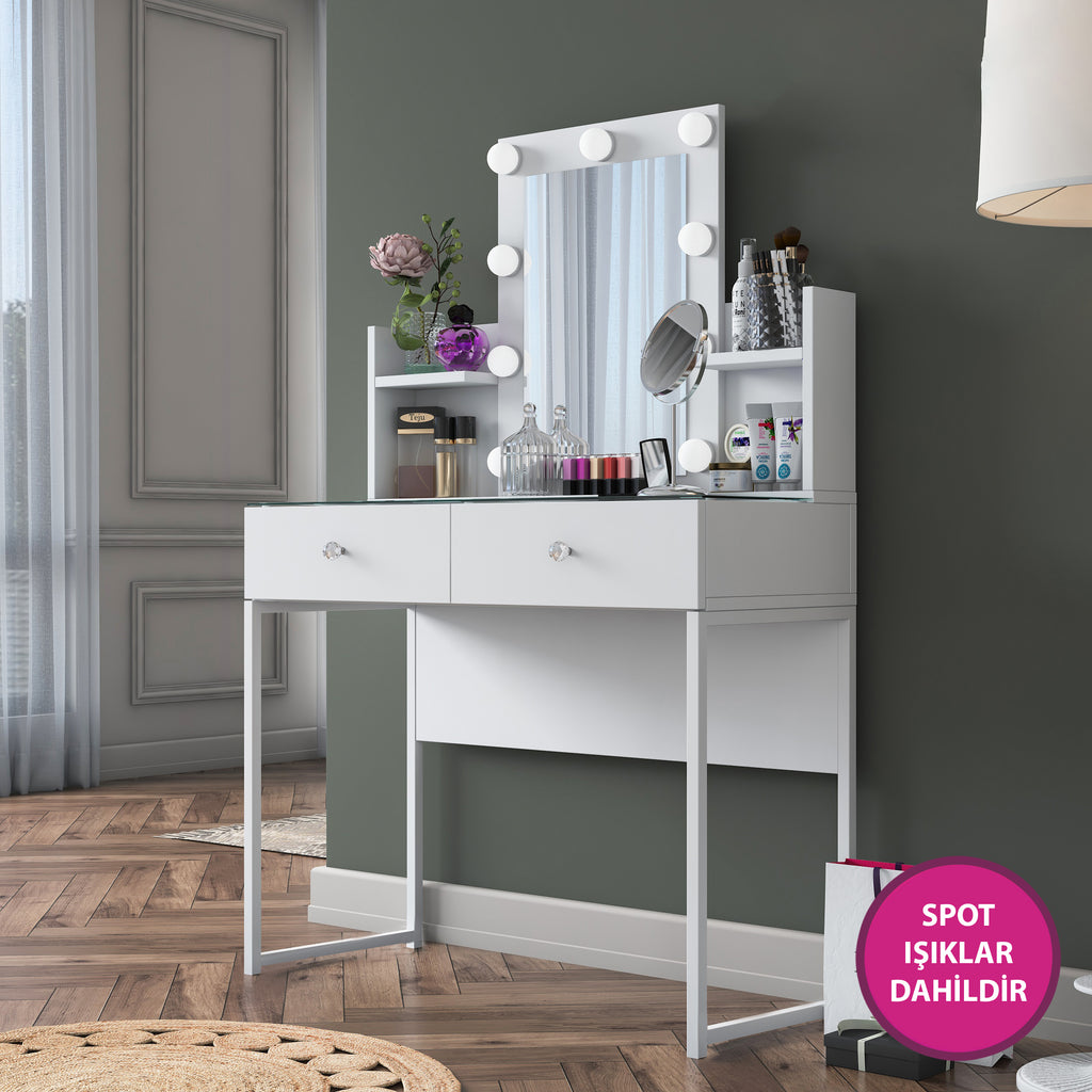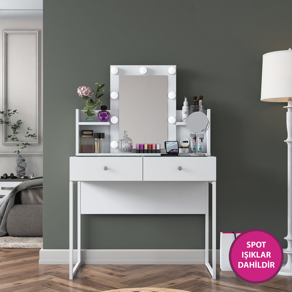Rani BJ145 Hollywood Işıklı Aynalı Kulis Makyaj Masası Cam Tablalı 2 Çekmeceli Takı Düzenleyici Beyaz