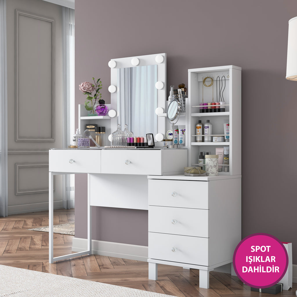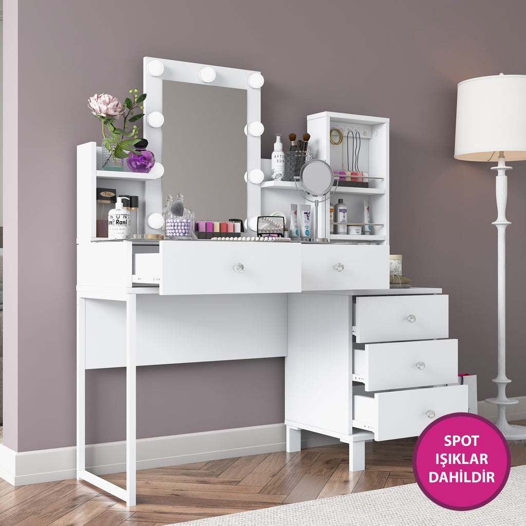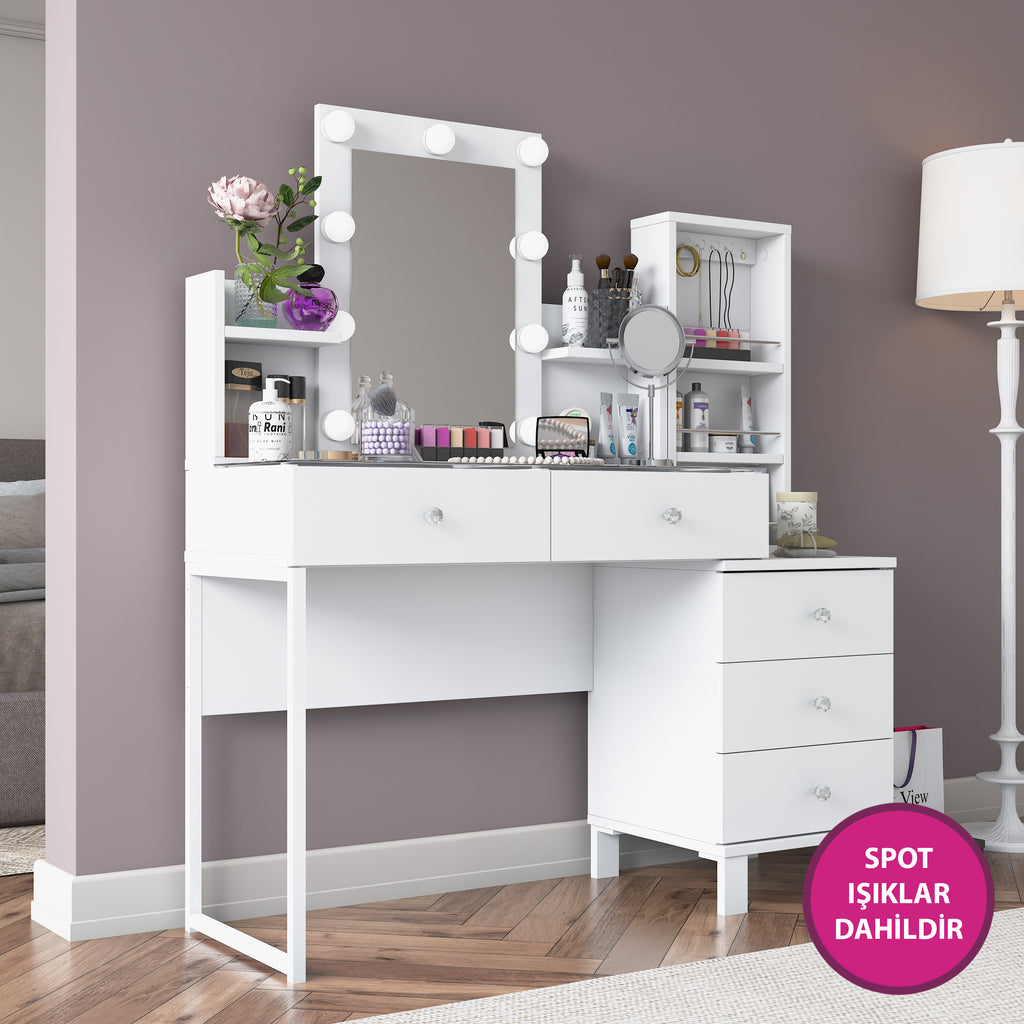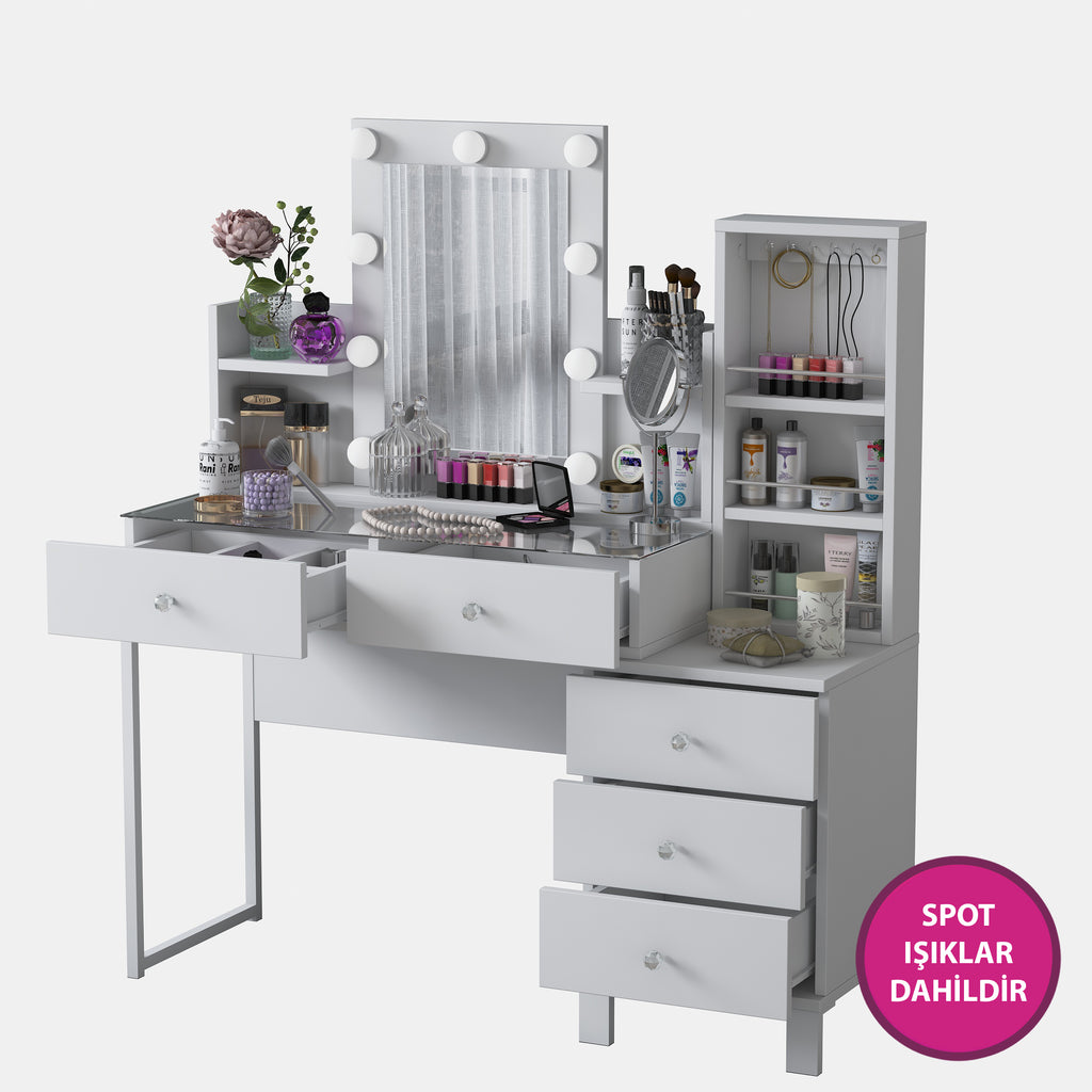 Rani BJ153 Hollywood Işıklı Aynalı Kulis Makyaj Masası Cam Tablalı 5 Çekmeceli Takı Düzenleyici Beyaz