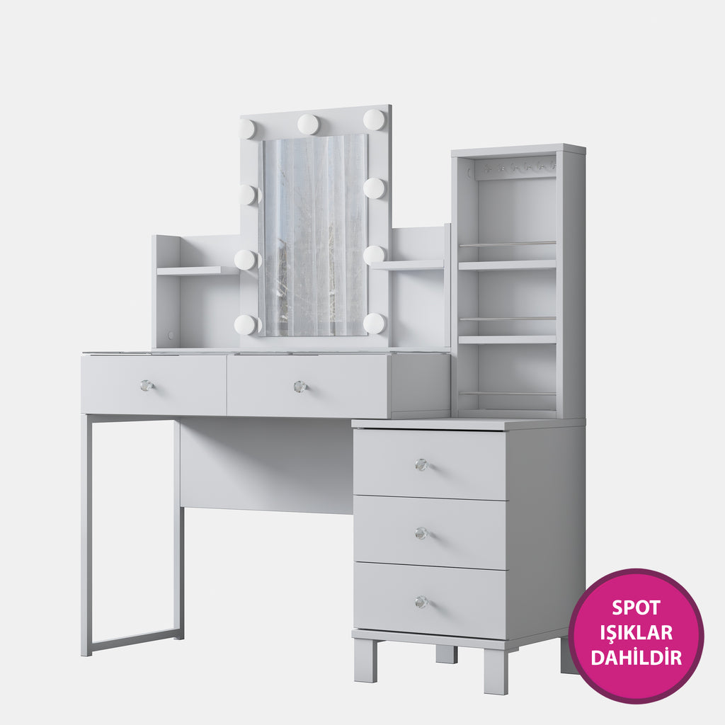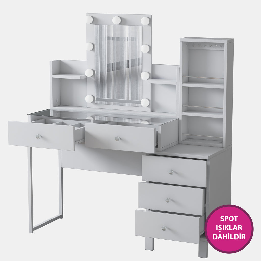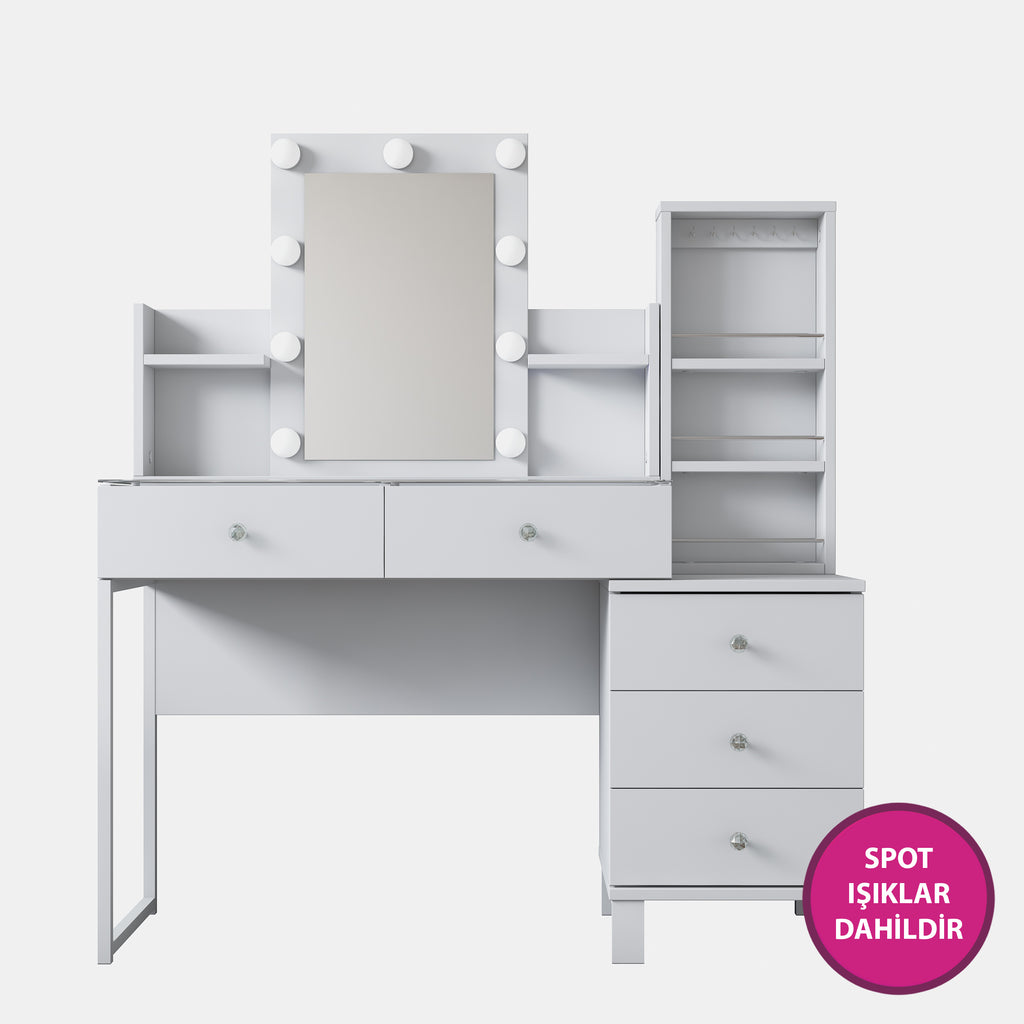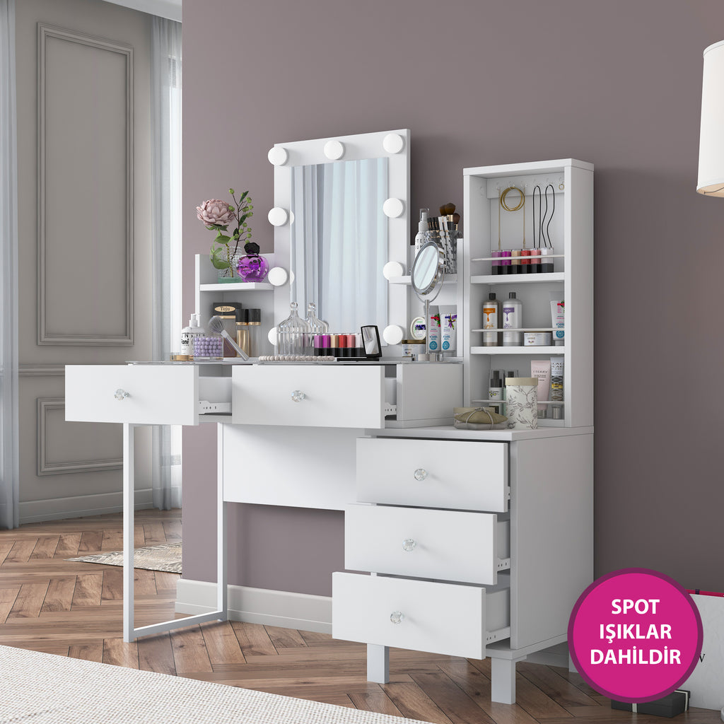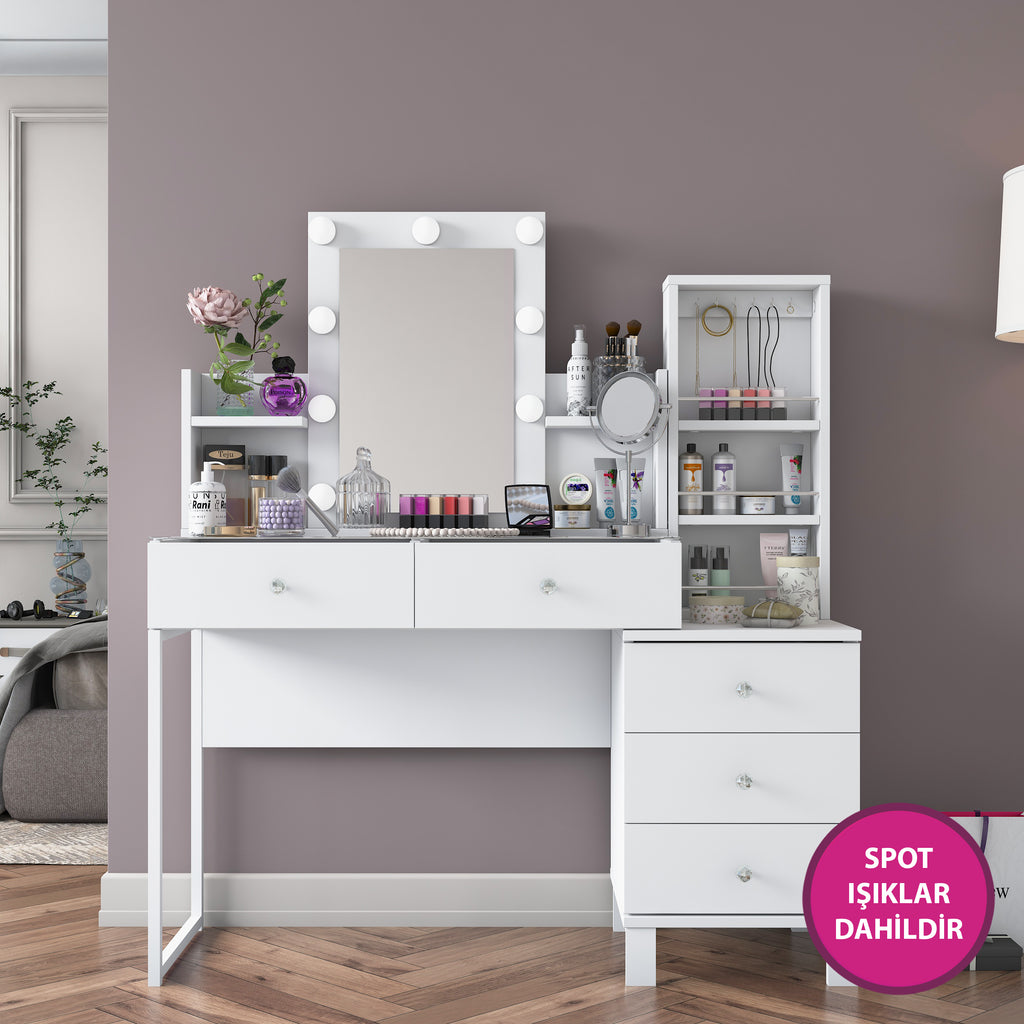 Rani BJ153 Hollywood Işıklı Aynalı Kulis Makyaj Masası Cam Tablalı 5 Çekmeceli Takı Düzenleyici Beyaz