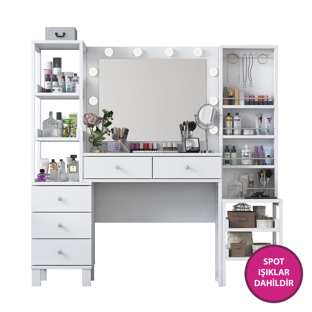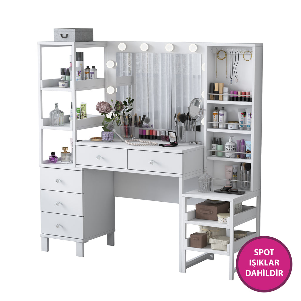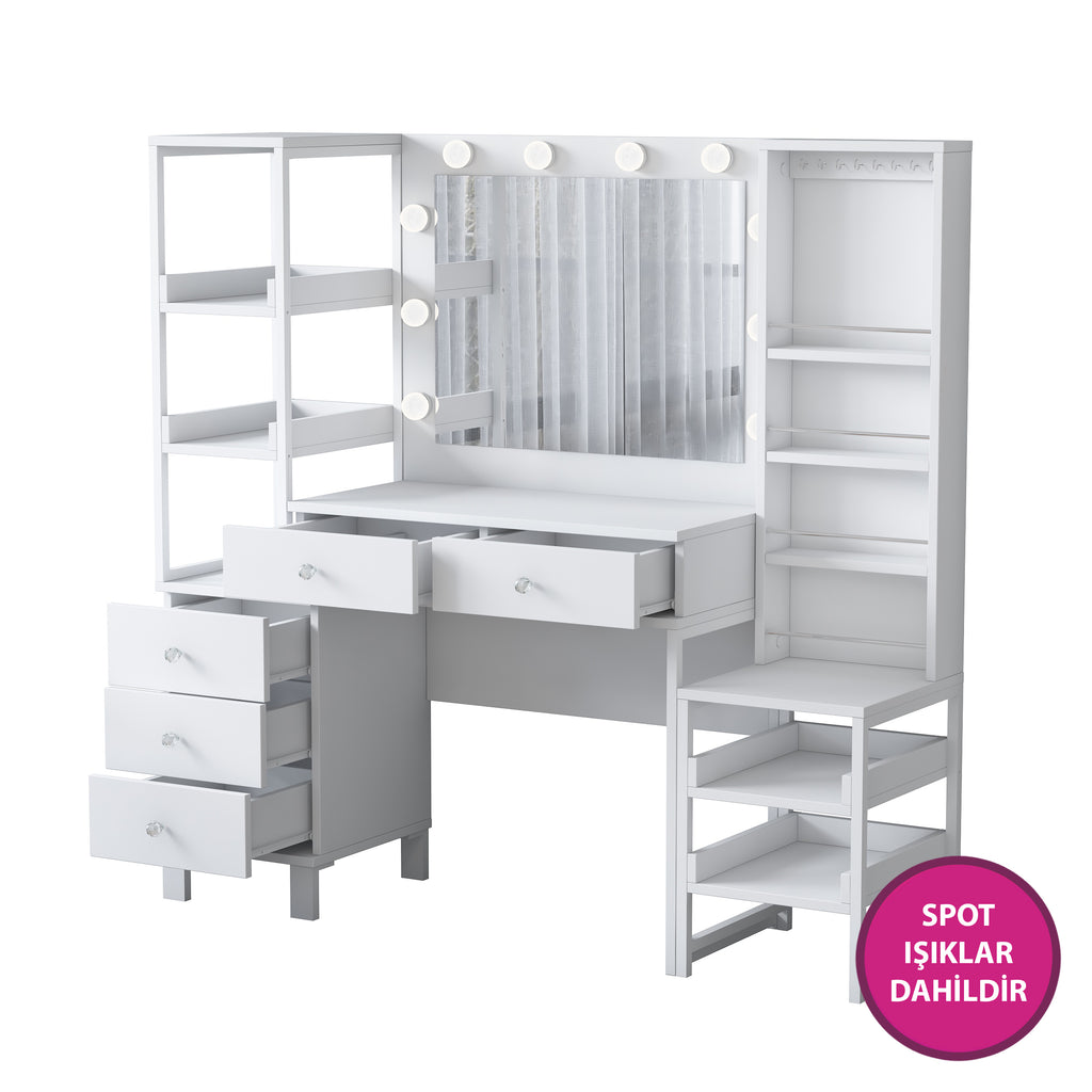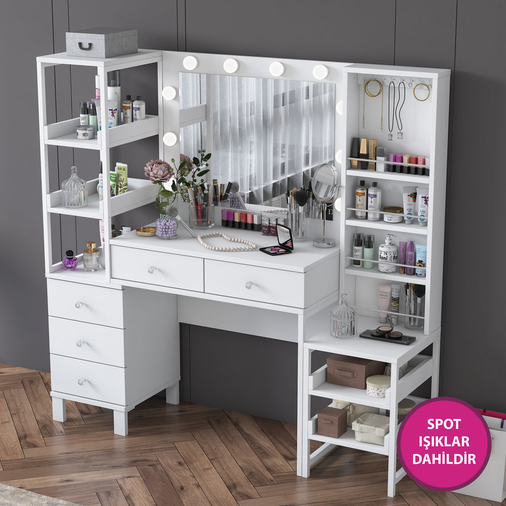 Rani BJ154 Hollywood Işıklı Aynalı Kulis Makyaj Masası 5 Çekmeceli Açık Raflı Takı Düzenleyici Beyaz