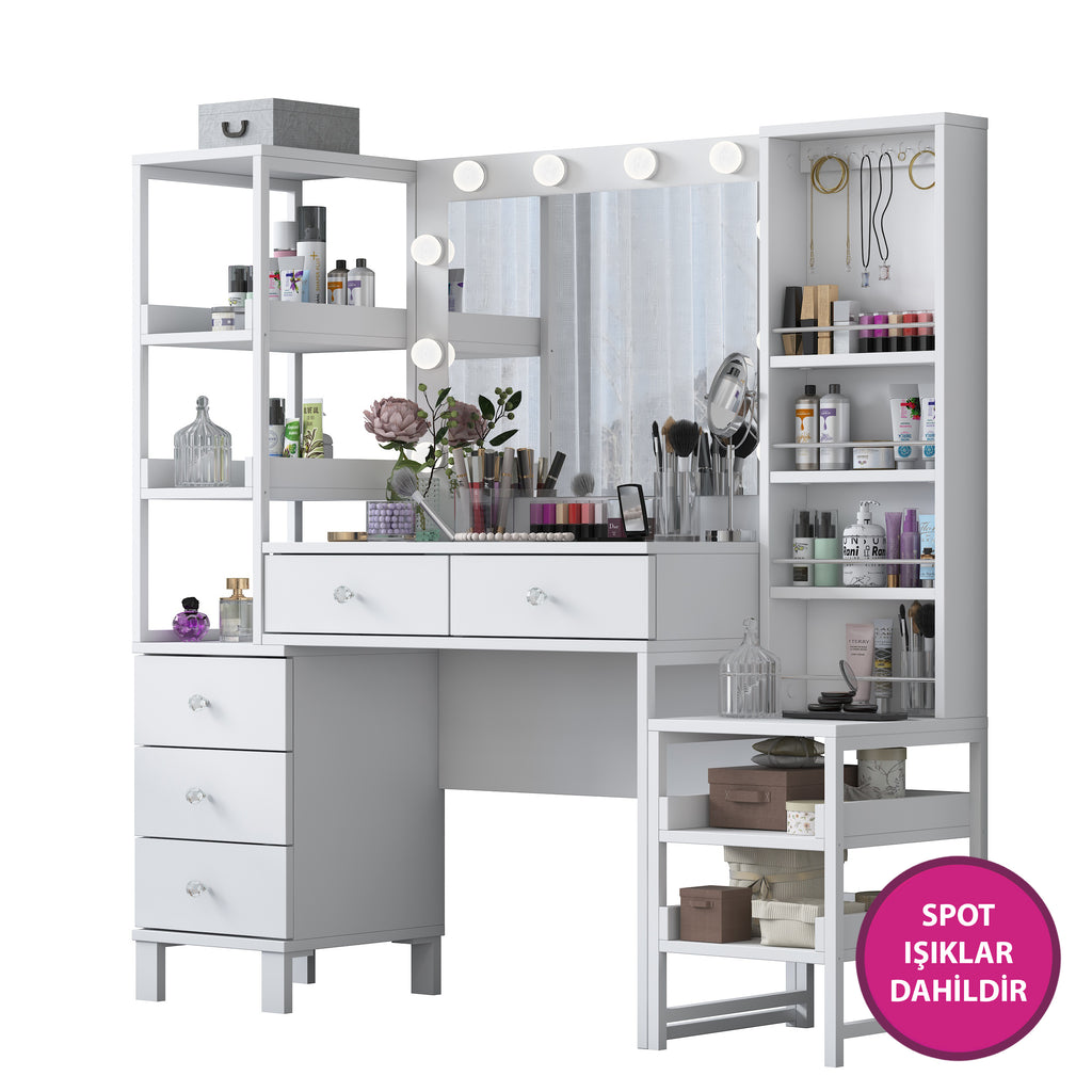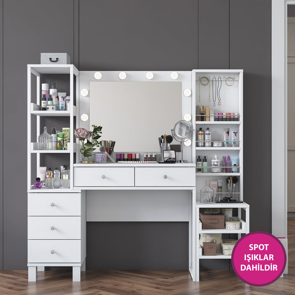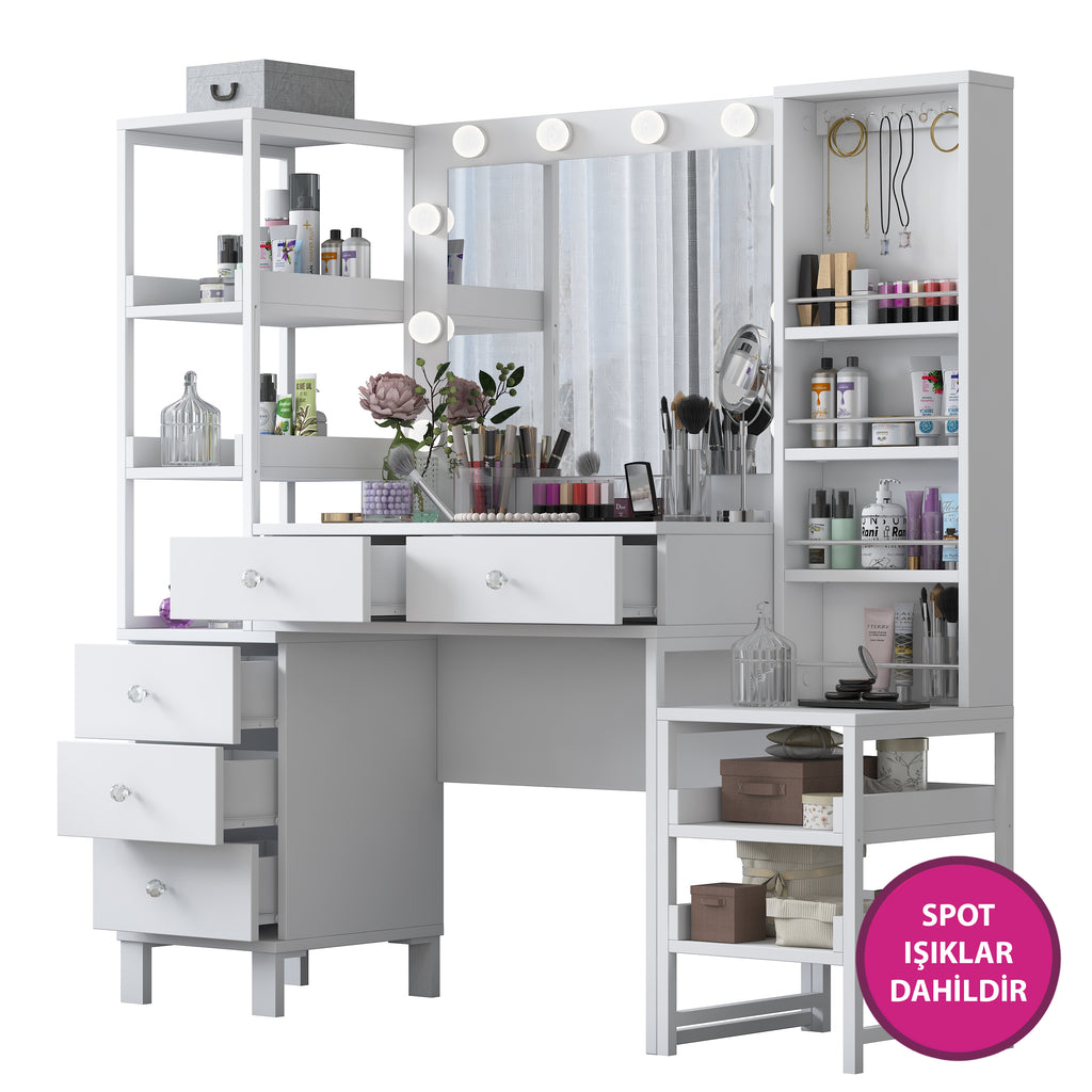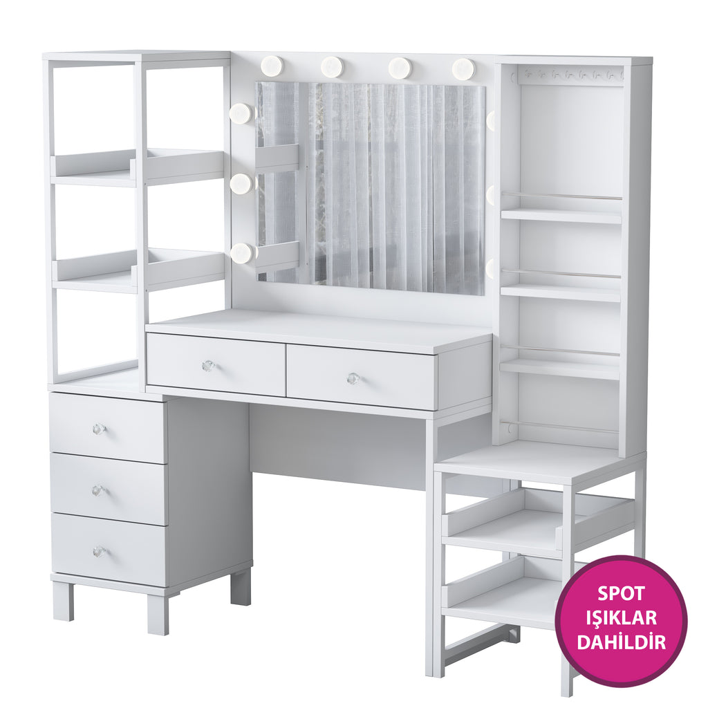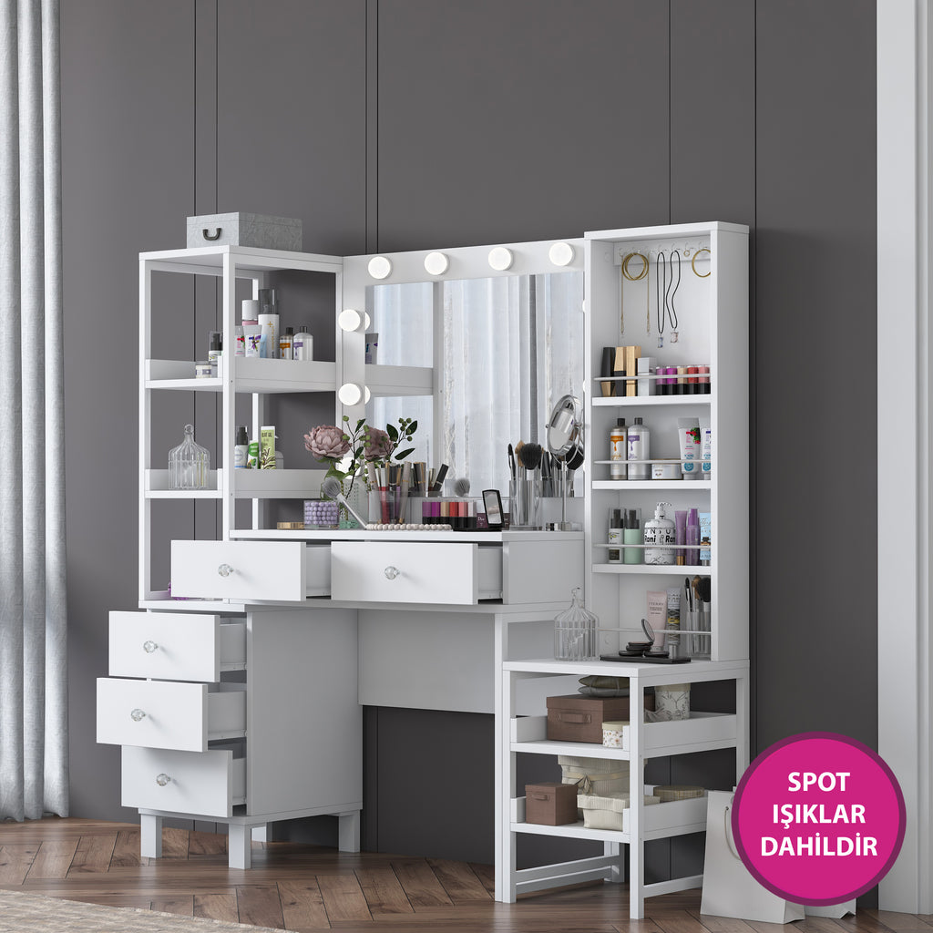 Rani BJ154 Hollywood Işıklı Aynalı Kulis Makyaj Masası 5 Çekmeceli Açık Raflı Takı Düzenleyici Beyaz