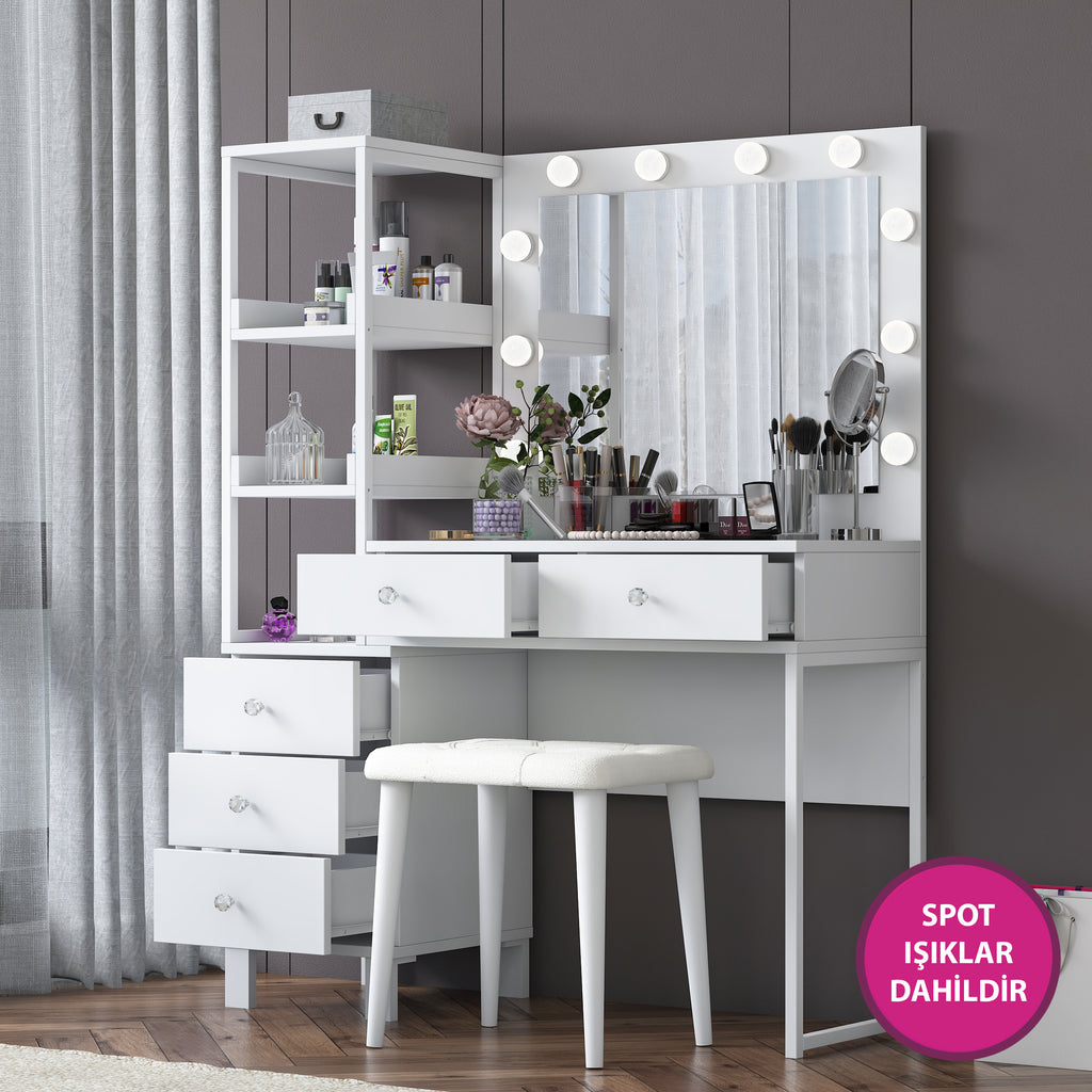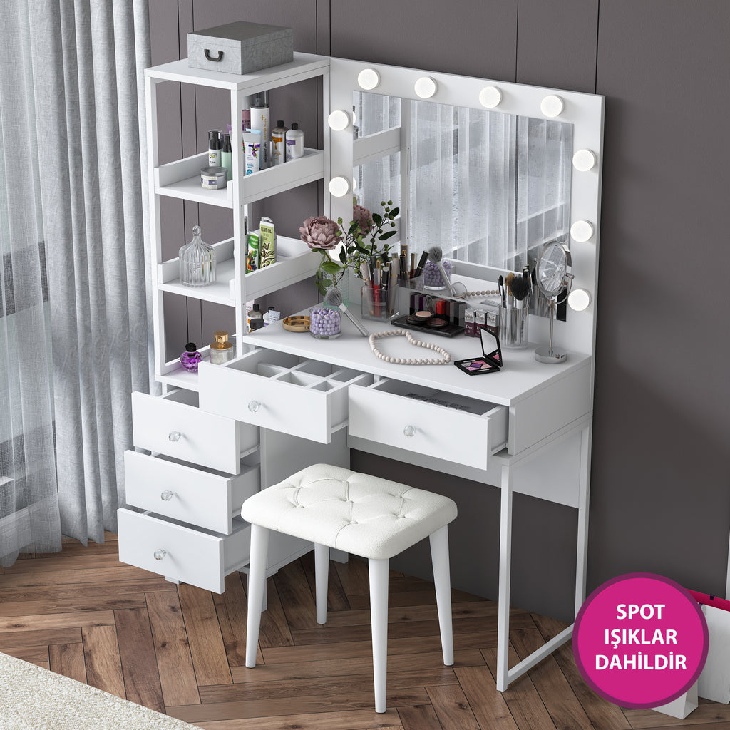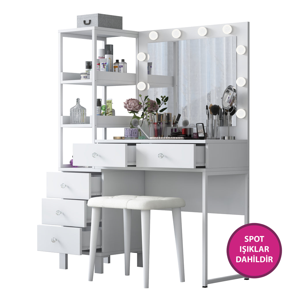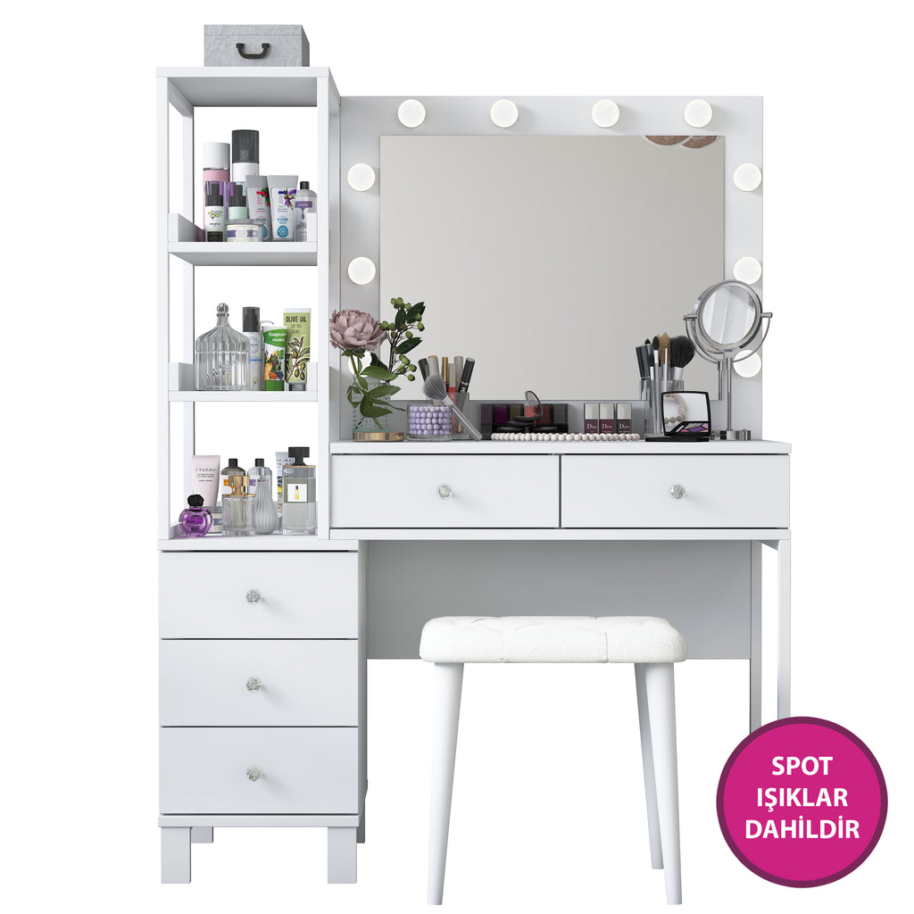 Rani BJ155 Makyaj Masası 5 Çekmeceli Raflı Işıklı Aynalı Takı Düzenleyici Puf Takım Beyaz