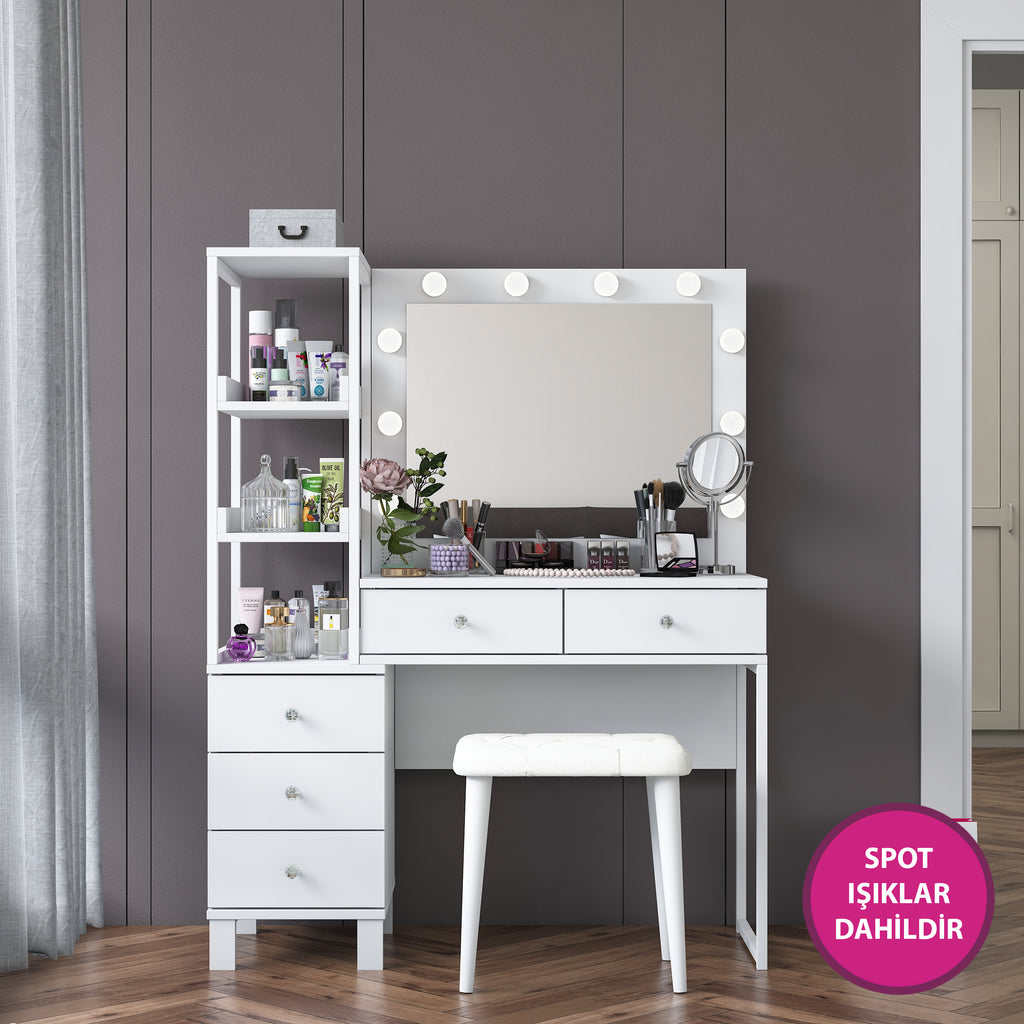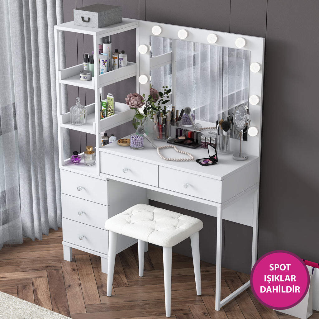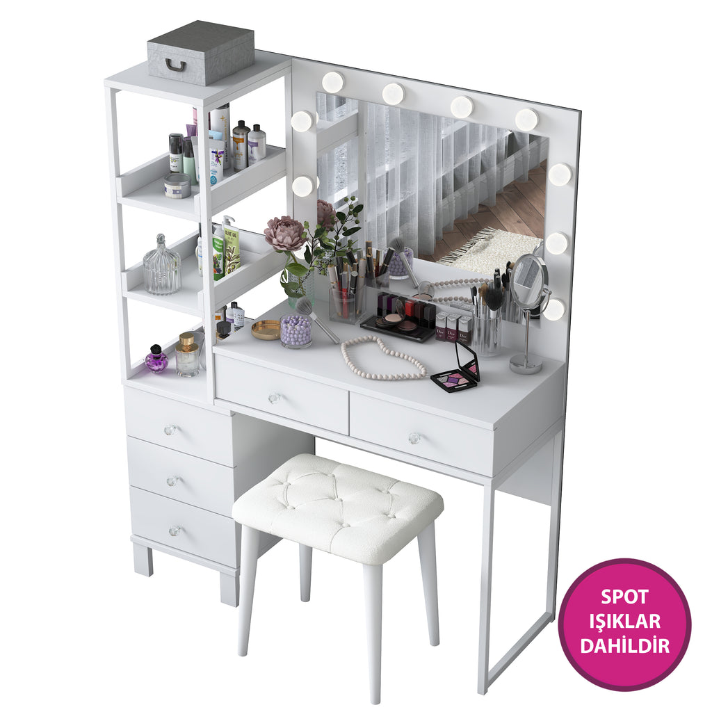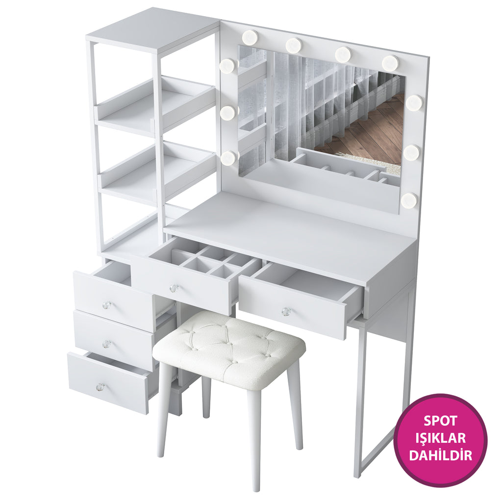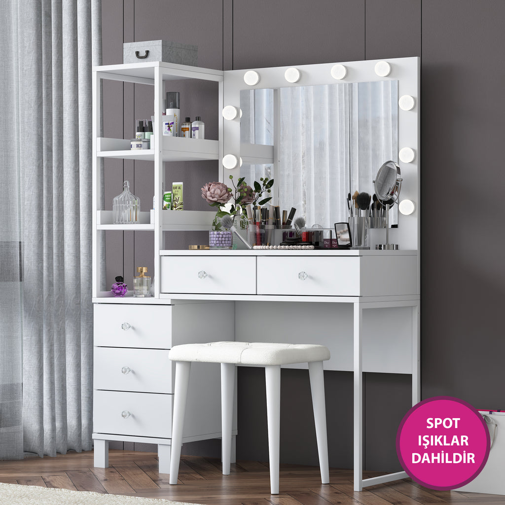 Rani BJ155 Makyaj Masası 5 Çekmeceli Raflı Işıklı Aynalı Takı Düzenleyici Puf Takım Beyaz