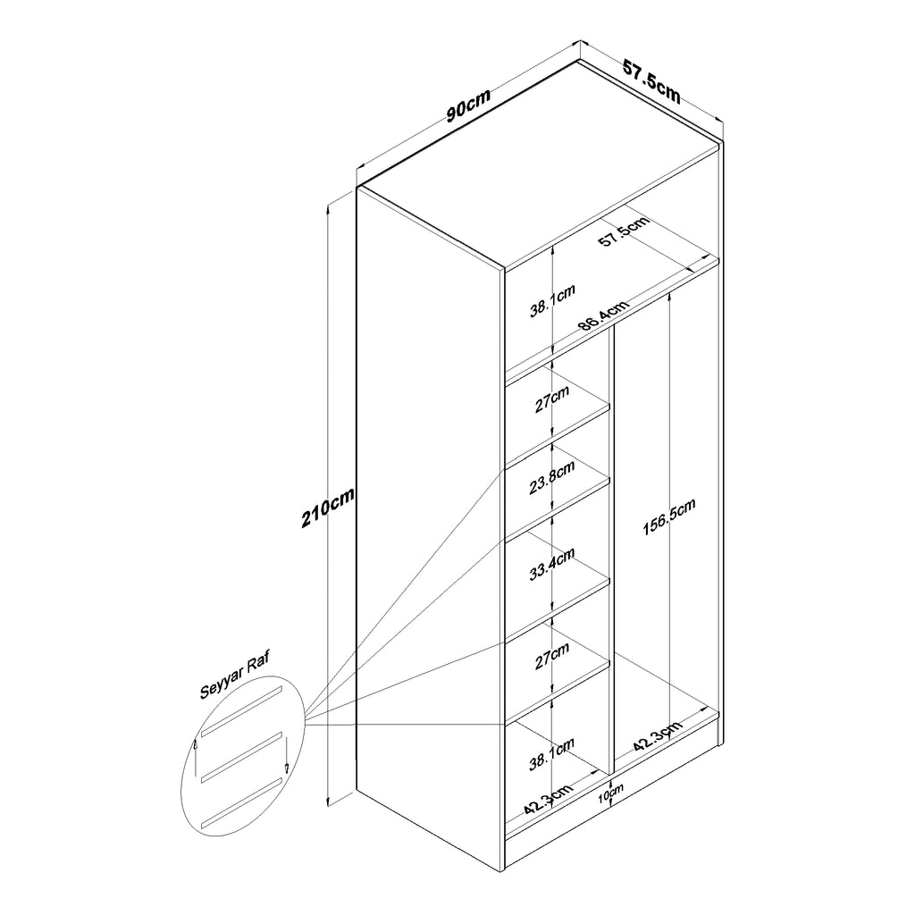 Genişlik: 90 cm - Derinlik: 57,5 cm - Yükseklik: 210 cm