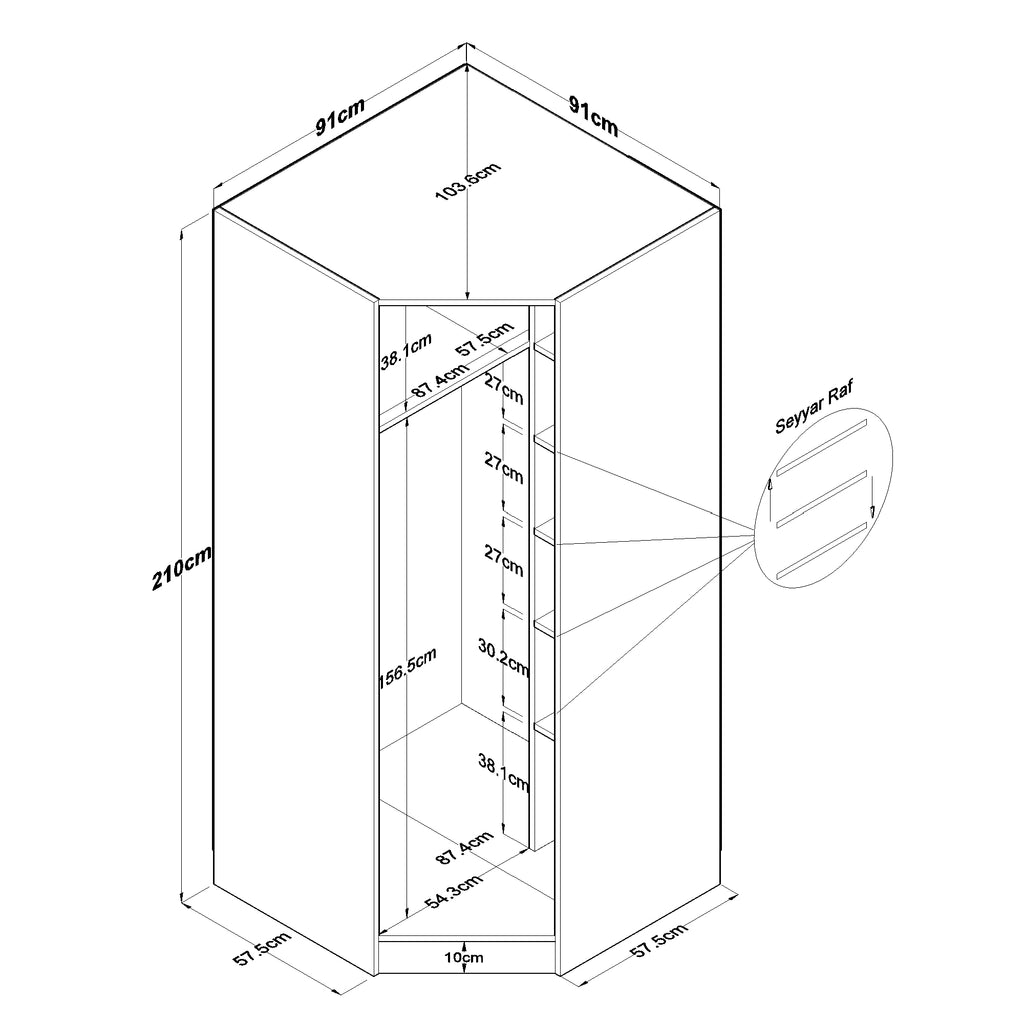 Genişlik: 91 cm - Derinlik: 57,5 cm - Yükseklik: 210 cm