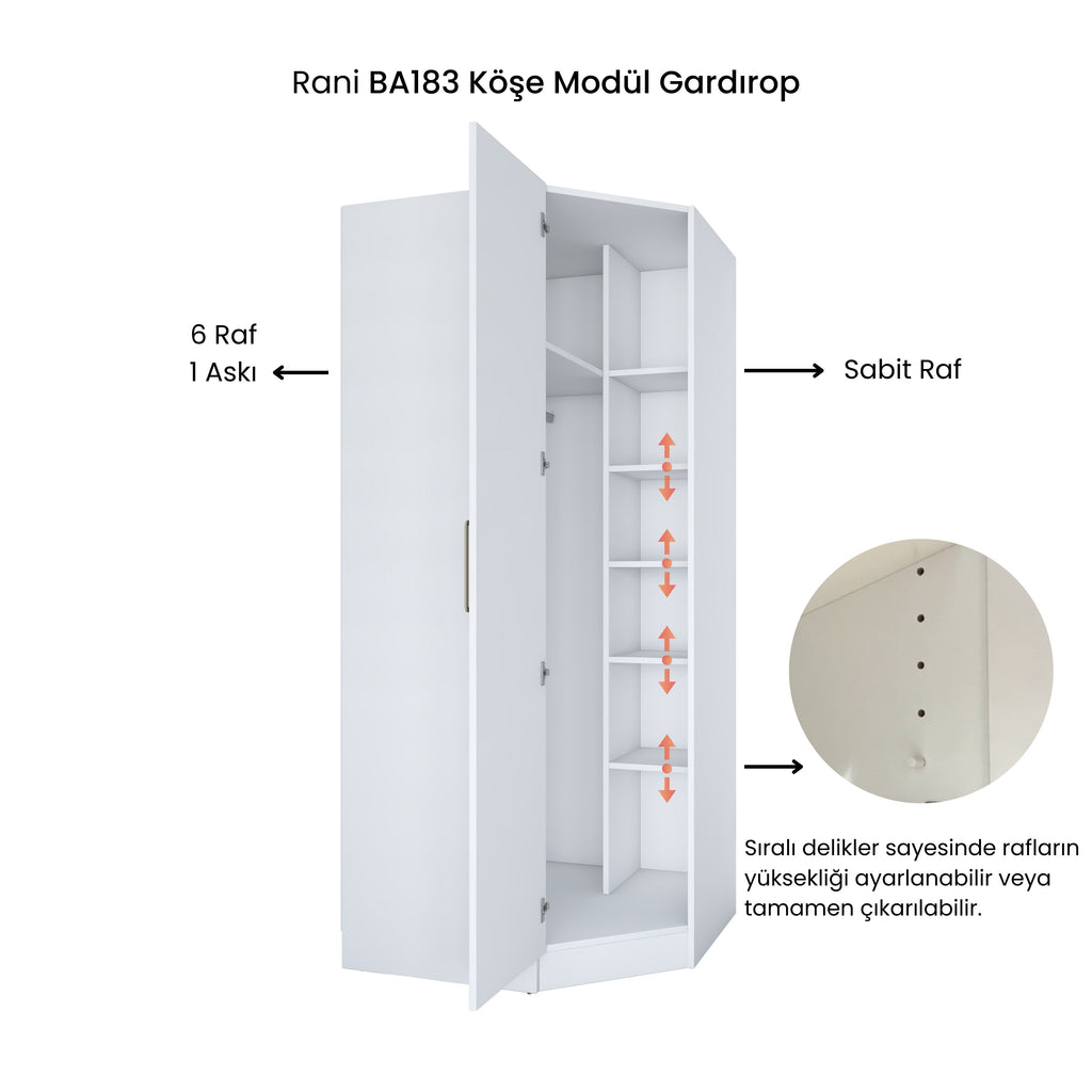 * Köşe Modül Gardırop, modern tasarımı ve işlevsel yapısıyla evinizde köşe alanlarını en verimli şekilde değerlendirmenize yardımcı olur.