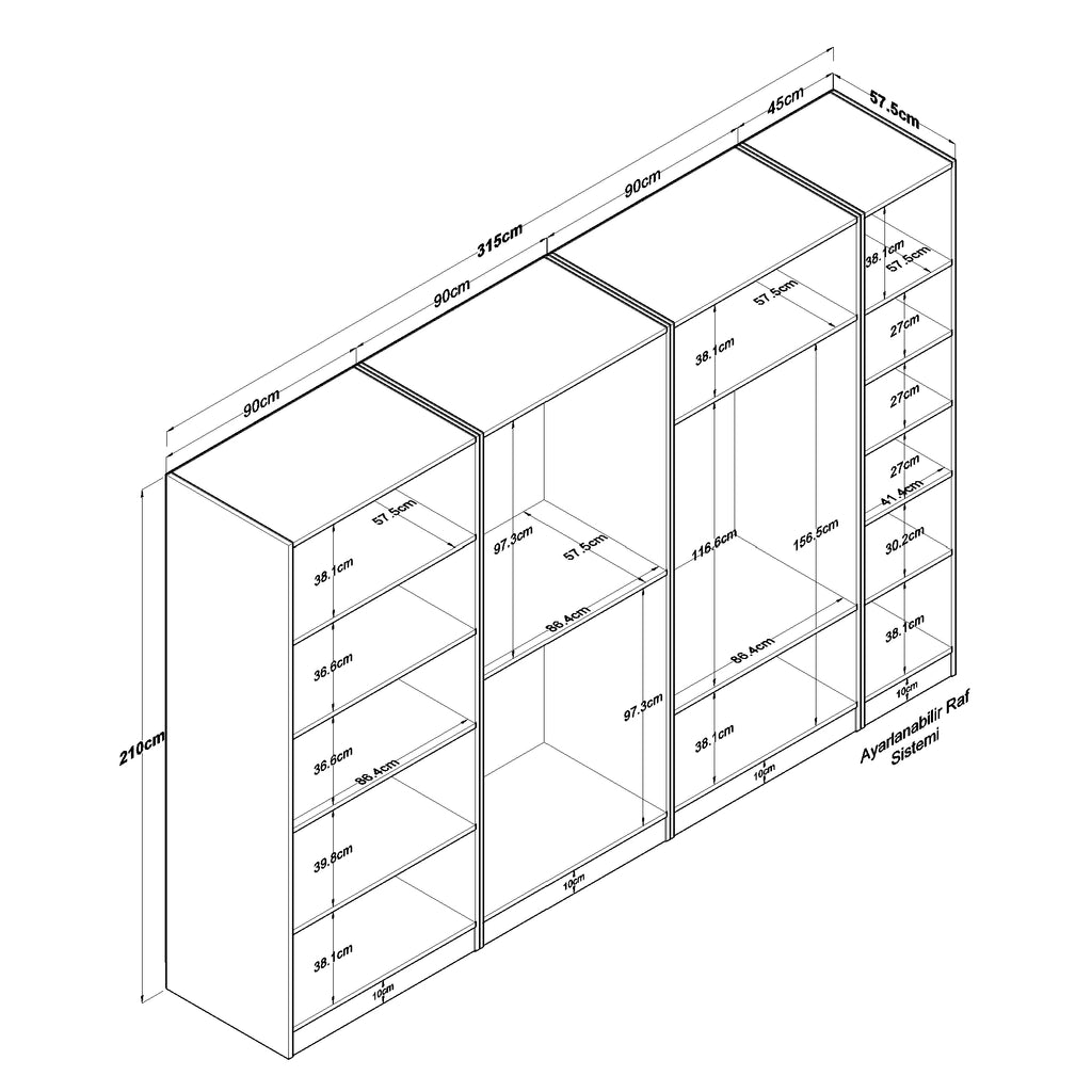 Gardırop: Genişlik: 315 cm - Derinlik: 57,5 cm - Yükseklik: 210 cm