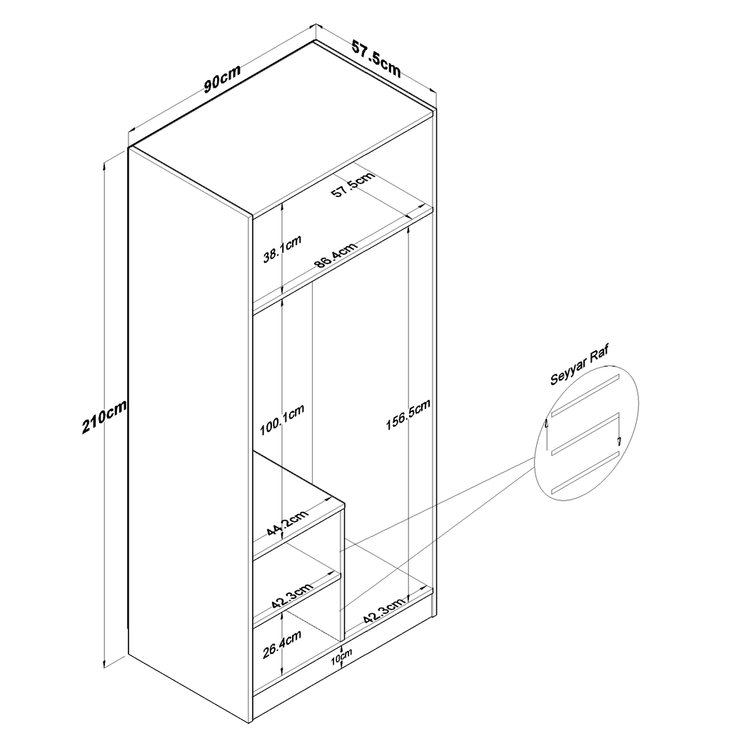 Genişlik: 90 cm - Derinlik: 57,5 cm - Yükseklik: 210 cm