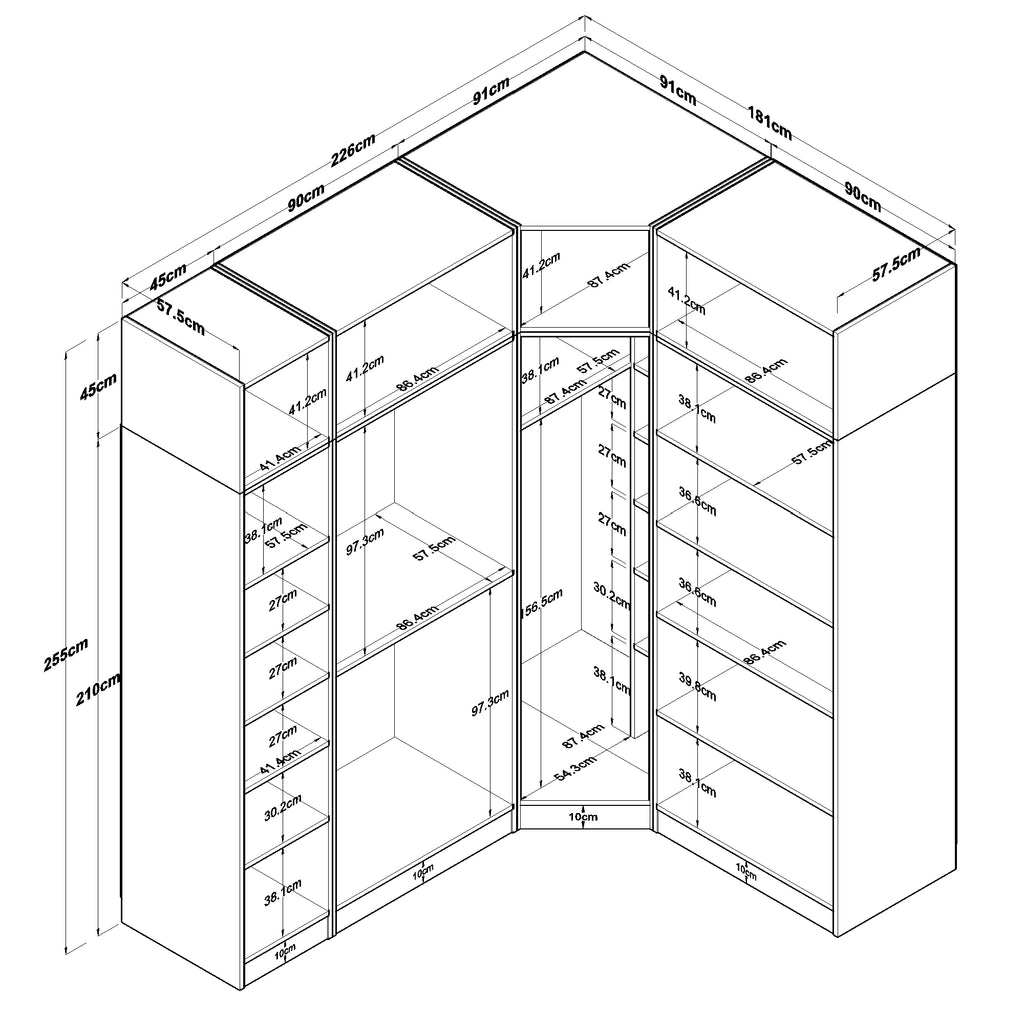 Gardırop: Sol Genişlik: 226 cm Sağ Genişlik: 181 cm - Derinlik: 57,5 cm - Yükseklik: 255 cm