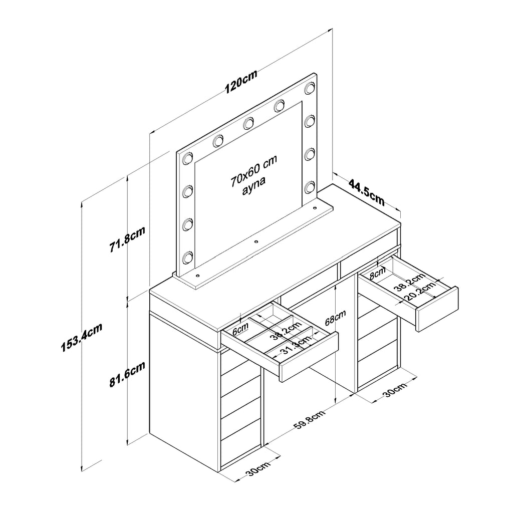 Makyaj Aynası: Genişlik: 90 cm - Derinlik: 15 cm - Yükseklik: 71,8 cm