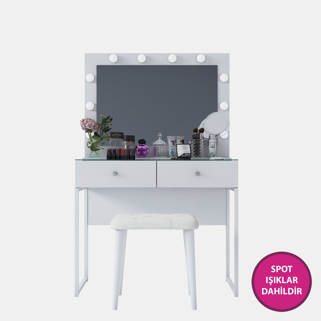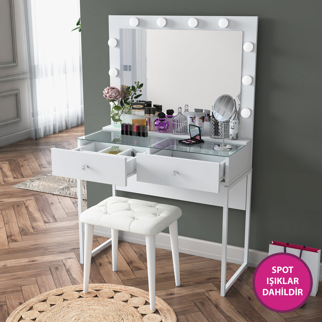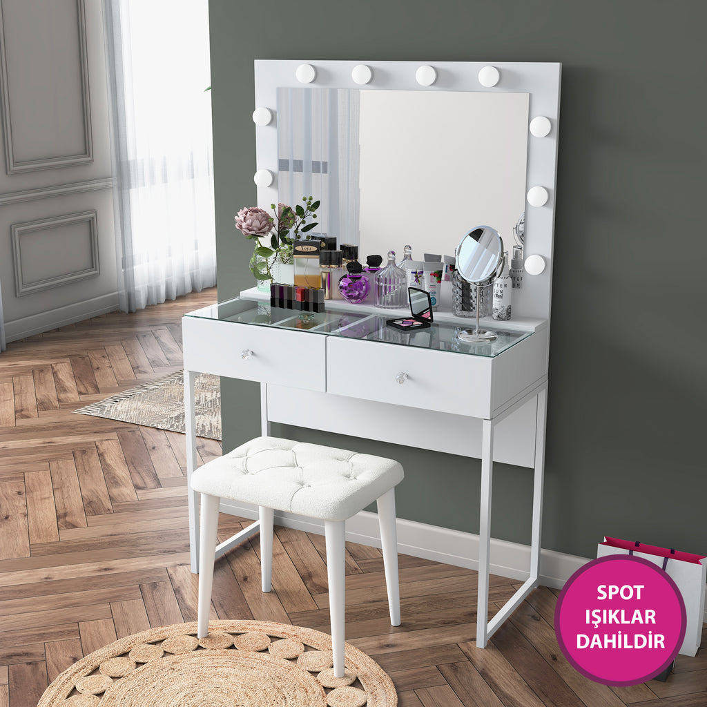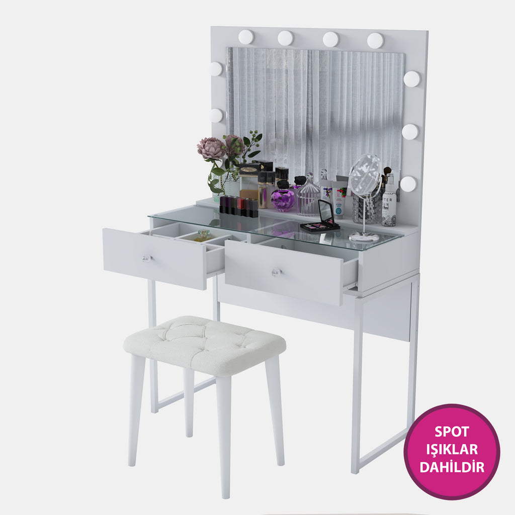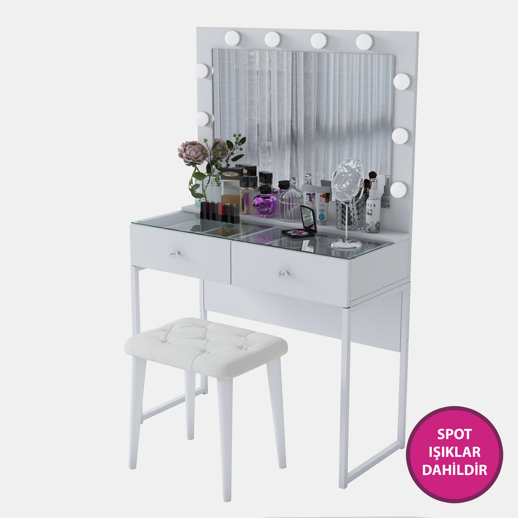 Rani BJ164 Hollywood Işıklı Aynalı Kulis Makyaj Masası Cam Tablalı 2 Çekmeceli Takı Düzenleyici Puf Takım Beyaz