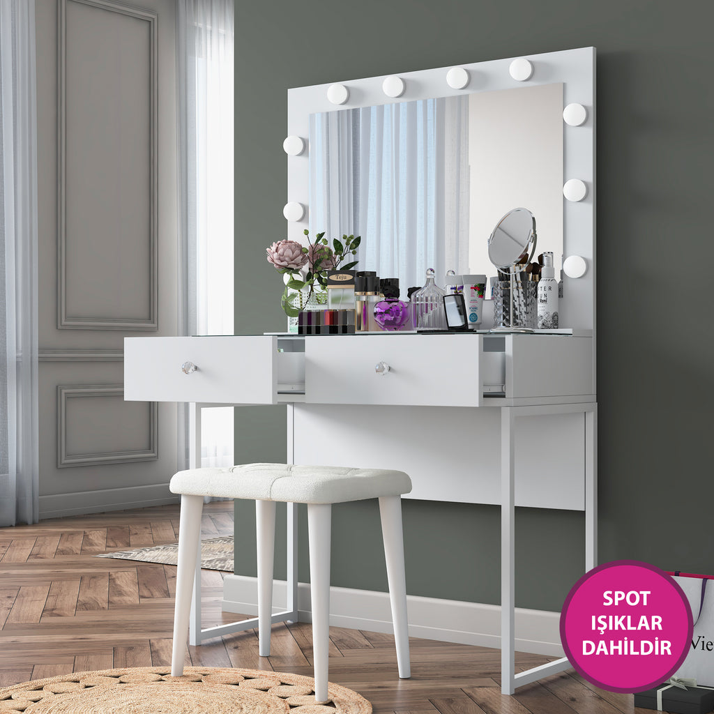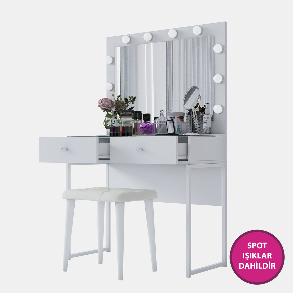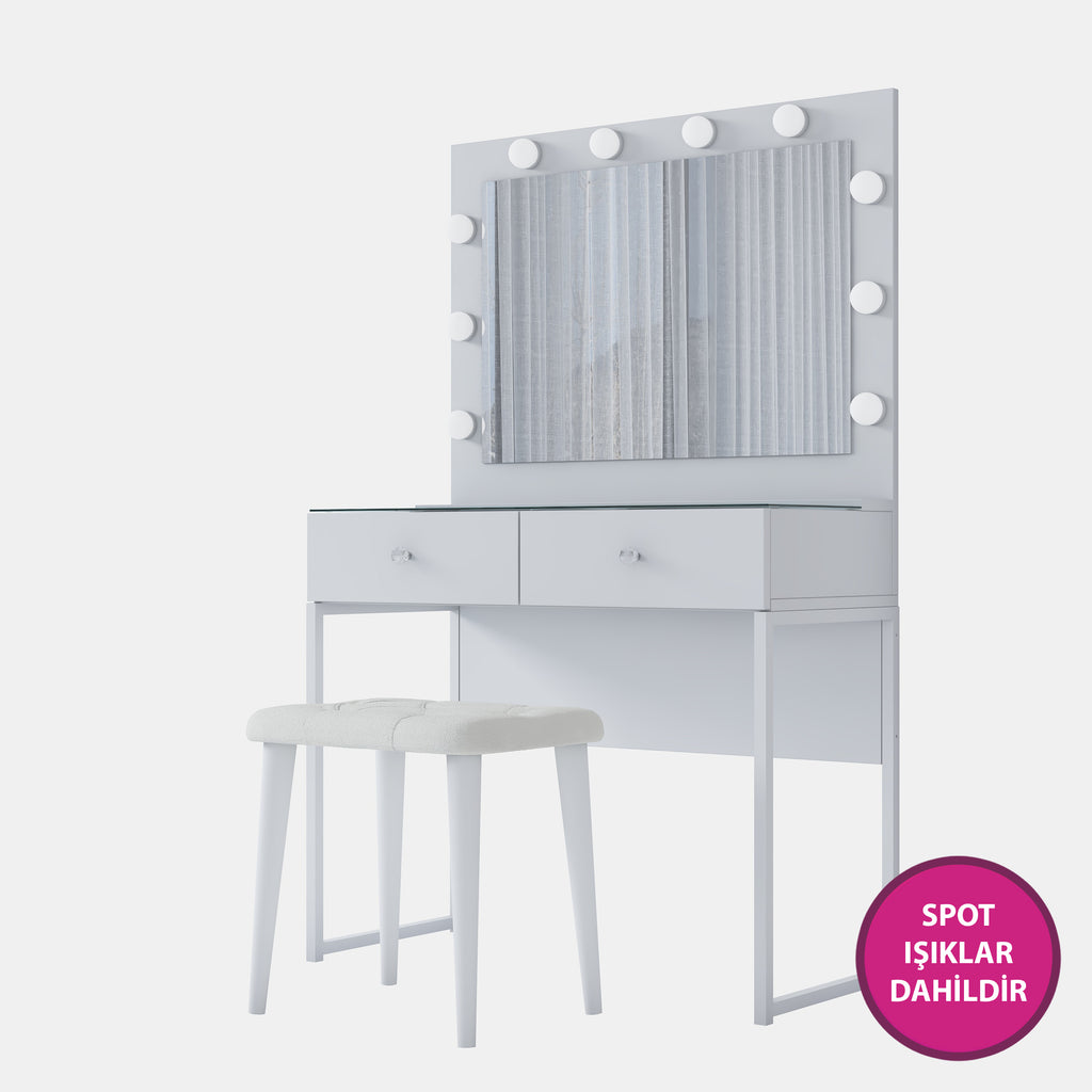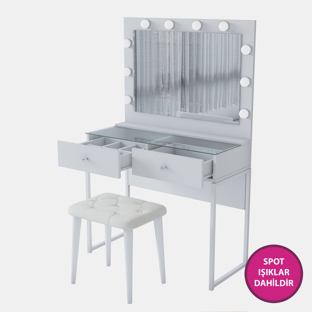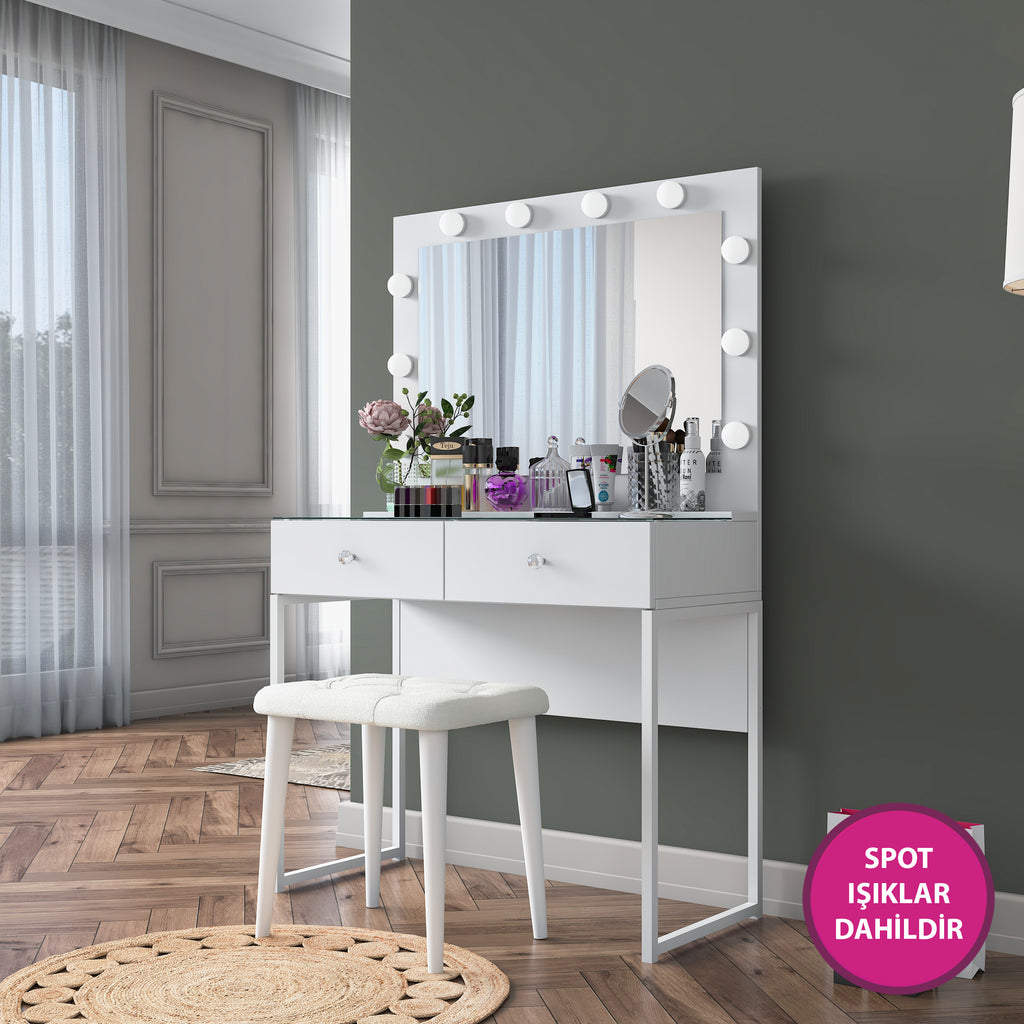 Rani BJ164 Hollywood Işıklı Aynalı Kulis Makyaj Masası Cam Tablalı 2 Çekmeceli Takı Düzenleyici Puf Takım Beyaz